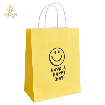 উপহার প্যাকেজের জন্য পরিবেশ বান্ধব উপাদান সহ প্রলিপ্ত হলুদ মুদ্রিত কাগজের শপিং ব্যাগ
