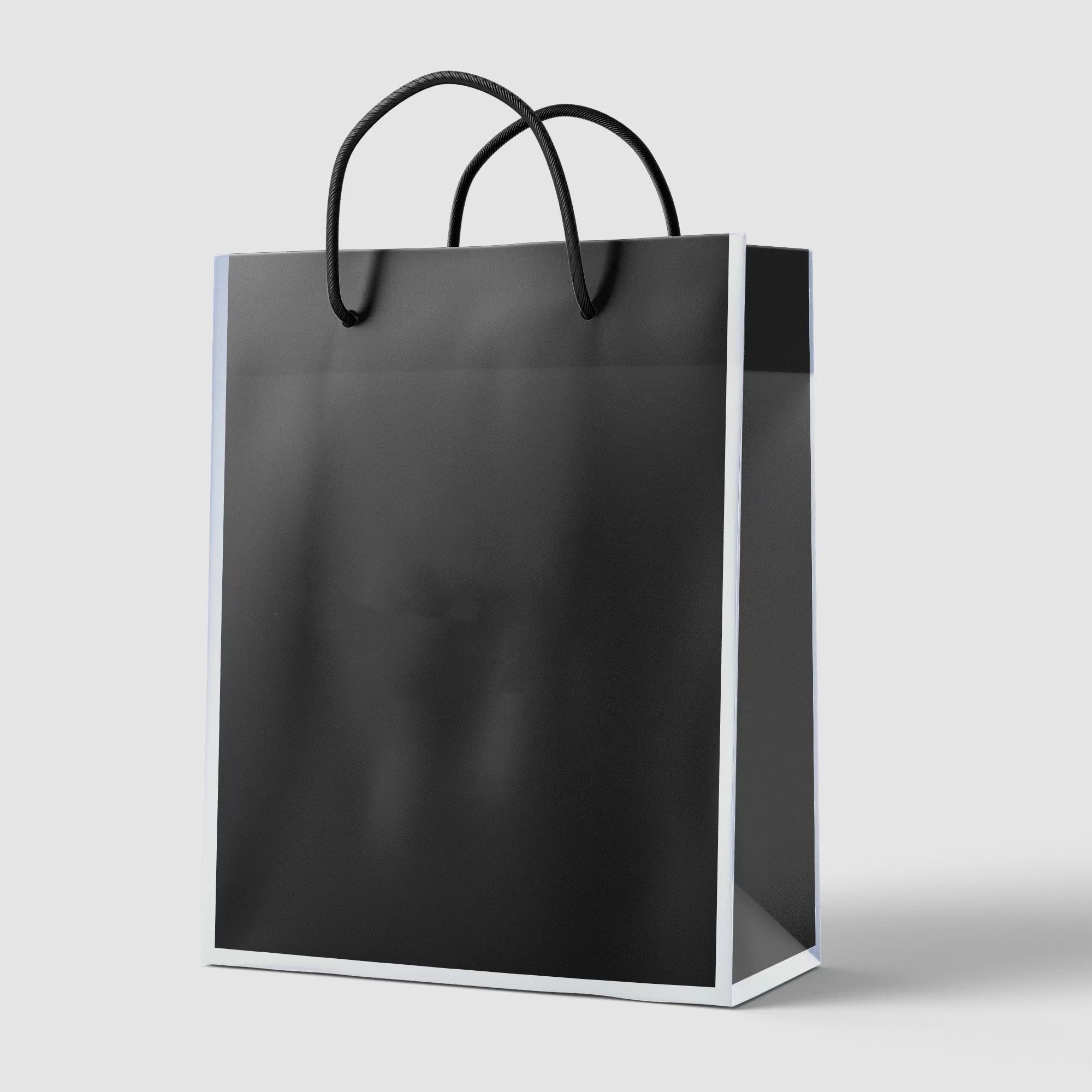উপহার প্যাকেজিংয়ের জন্য দড়ি হ্যান্ডেল সহ কালো আর্ট পেপার প্রিন্টেড পেপার শপিং ব্যাগ