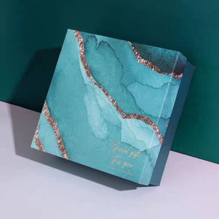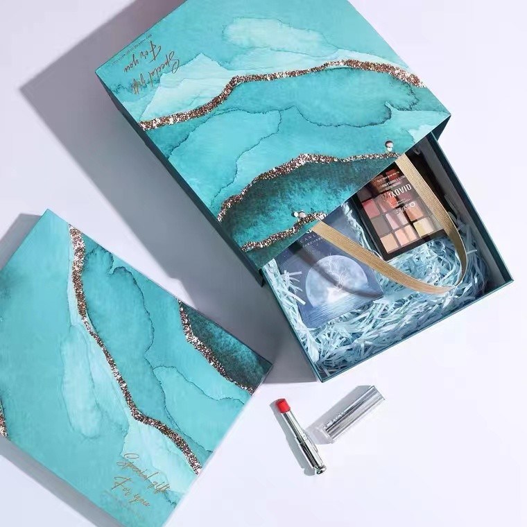 ব্লু আর্ট পেপার পেপারবোর্ড গিফট বক্স কাস্টম পেপার প্যাকেজিং অনমনীয় ঢাকনা এবং কসমেটিক গিফট প্যাকেজিং এর জন্য বেস