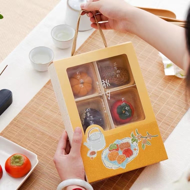 খাদ্য প্যাকেজিংয়ের জন্য রিবন হ্যান্ডেল পেপার ইনসার্টার সহ হলুদ প্রলিপ্ত কাগজ ভাঁজযোগ্য উপহার বাক্স